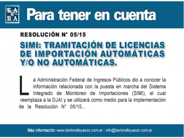 La Administración Federal de Ingresos Públicos dio a conocer la información relacionada con la puesta en marcha del Sistema Integrado de Monitoreo de Importaciones (SIMI), el cual reemplaza a la DJAI y se utilizará como medio para la implementación de la Resolución N° 05/15 (Licencias Automáticas y No Automáticas).