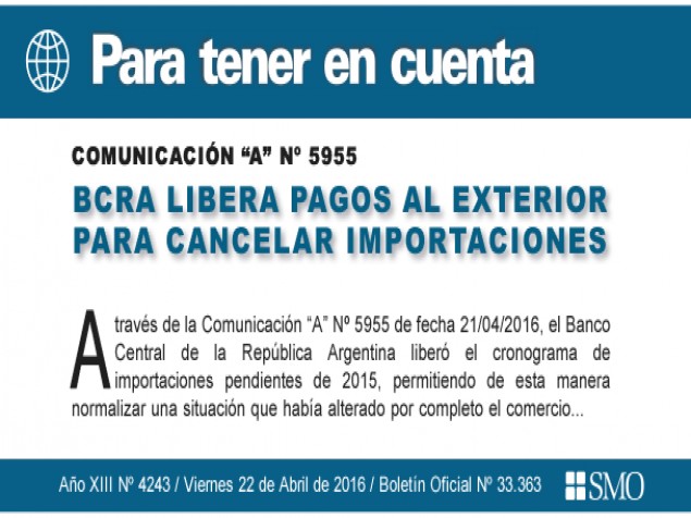 A través de la Comunicación “A” Nº 5955 de fecha 21/04/2016, el Banco Central de la República Argentina liberó el cronograma de importaciones pendientes de 2015, permitiendo de esta manera normalizar una situación que había alterado por completo el comercio exterior debido a la restricción que el ente monetario había dispuesto el año pasado.