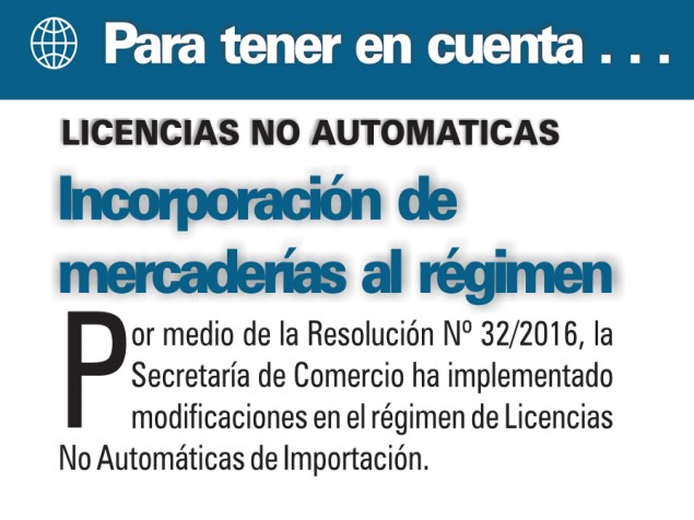 Por medio de la Resolución Nº 32/2016, la Secretaría de Comercio ha implementado modificaciones en el régimen de Licencias No Automáticas de Importación.