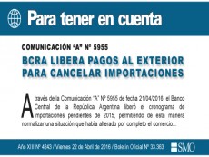 22/04/2016 | El Banco Central liberó ayer los pagos para importaciones previas a diciembre pasado. Hasta el momento, la autoridad monetaria se había comprometido a abonar a través de un cronograma de vencimient...